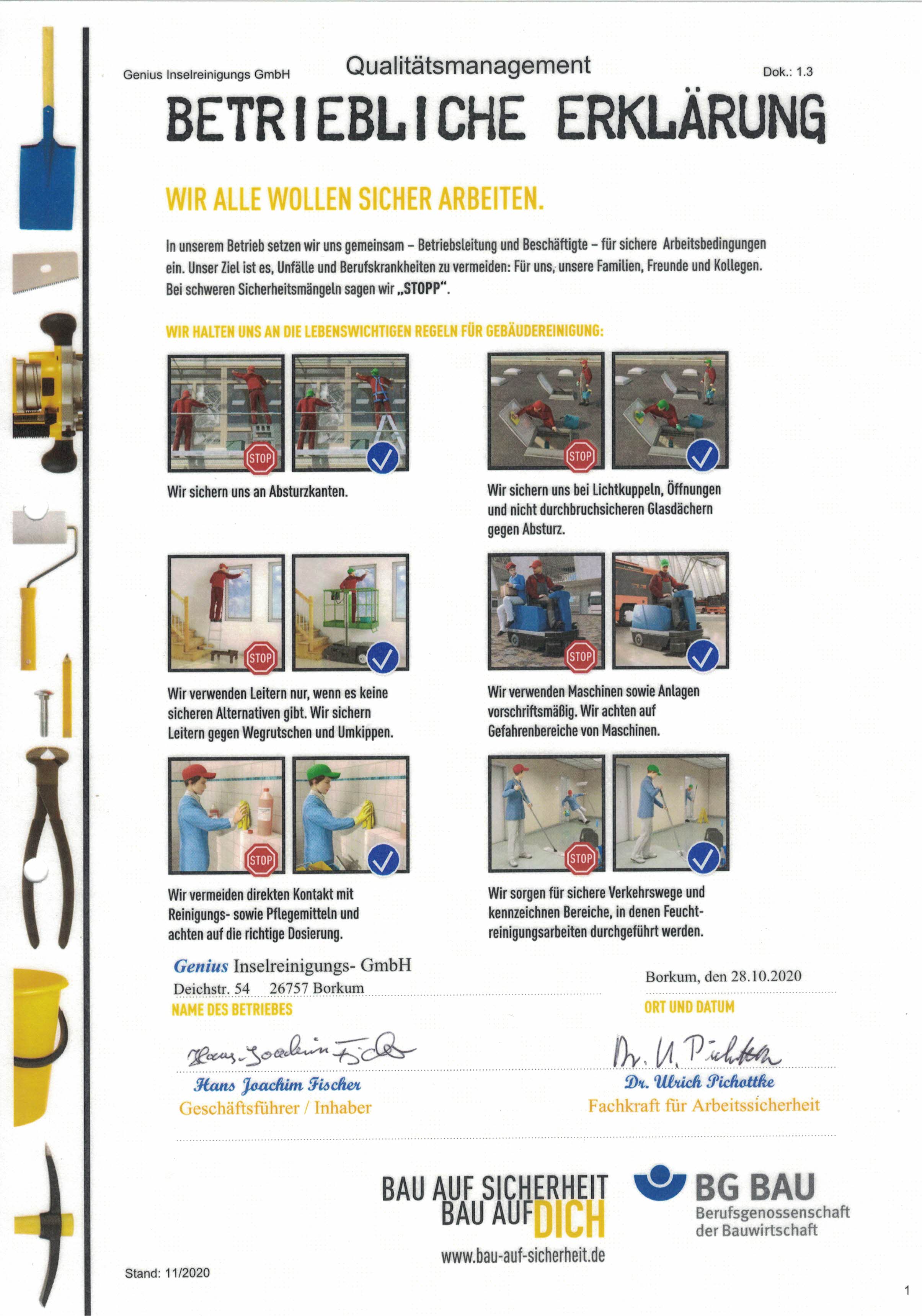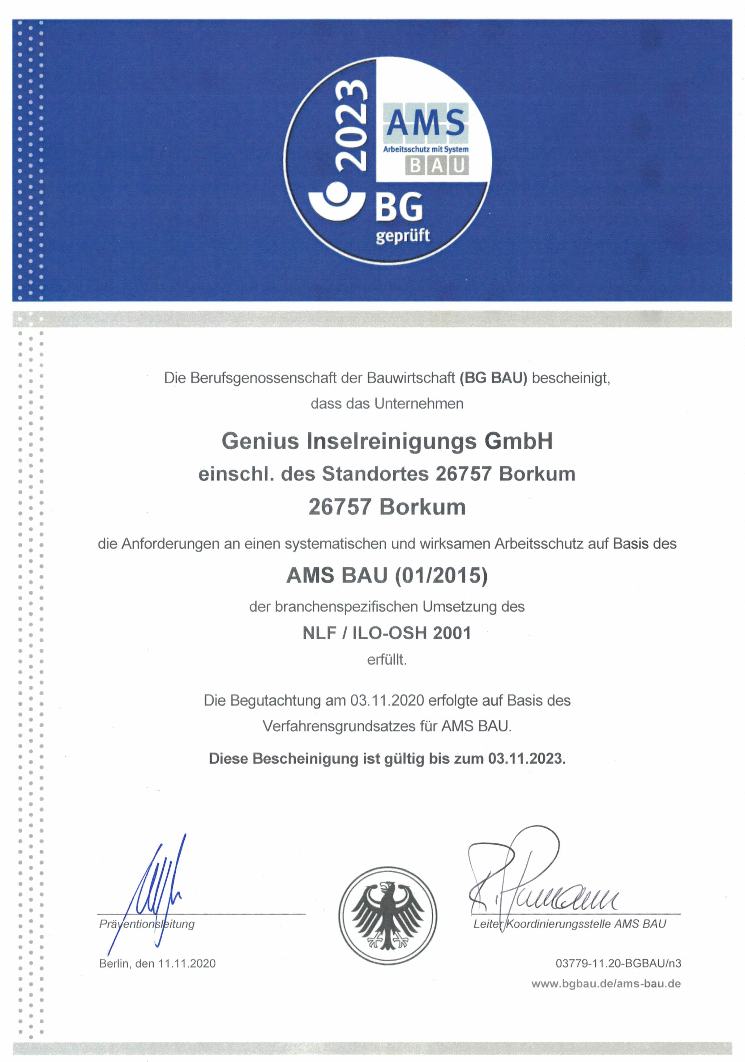 PRESSEMITTEILUNG Klares Statement für den Arbeitsschutz Vorbildlicher Arbeitsschutz auch bei dem Unternehmen Genius Inselreinigungs- GmbH. "Dank effektivem Arbeitsschutz Management halten wir unsere Arbeitsstätten unfall- und störungsfrei!" Wer heute als Unternehmen der Bauwirtschaft im Wettbewerb bestehen möchte, braucht ein effektives Arbeitsschutzmanagementsystem (AMS). Mit dem praxisorientierten Produkt "AMS BAU" der Berufsgenossenschaft der Bauwirtschaft (BG BAU) hat das Unternehmen Genius Inselreinigungs- GmbH auf Borkum, seinen betrieblichen Arbeitsschutz effektiv organisiert - und kann nun als eines von mittlerweile über 1000 begutachteten Unternehmen in Deutschland die dazugehörige, begehrte Bescheinigung vorweisen. Damit setzt das Unternehmen Genius Inselreinigungs- GmbH ein klares Zeichen für die Sicherheit und Gesundheit seiner Mitarbeiterinnen und Mitarbeiter und stärkt die eigene Position am Markt - denn mittlerweile spielt der Arbeitsschutz nicht nur bei der Auftragsakquise, sondern auch im Wettbewerb um gute Nachwuchskräfte eine große Rolle. "Dank des effektiven Arbeitsschutz-Managements halten wir unsere Arbeitsstätten unfall- und störungsfrei", erklärte Herr Dr. Ulrich Pichottke als SiFa (Fachkraft für Arbeitssicherheit) und AMS- Beauftragter des Unternehmens Genius- Inselreinigungs GmbH. "Vor allem in der Praxis profitieren wir von dem gemeinsam mit der BG BAU durchgeführten Prozess, da wir nun über eine funktionierende Arbeitsschutz-Organisation verfügen und damit unsere Mitarbeiterinnen und Mitarbeiter optimal vor Unfällen schützen" fügte der Unternehmer und leitende Geschäftsführer der Firma Genius Inselreinigungs- GmbH, Herr Hans Joachim Fischer hinzu. Hintergrund: Das AMS BAU beruht auf der Grundlage des Nationalen Leitfadens für Arbeitsmanagementsysteme (NLF) und wurde in Zusammenarbeit mit dem Zentralverband de Deutschen Baugewerbes entwickelt. Das praxisorientierte Produkt unterstützt die Unternehmen der Bauwirtschaft und baunaher Dienstleistungen beim Aufbau und der Organisation wirksamer Arbeitsschutzmechanismen im Betrieb und legt den Focus auf sichere und gesunde Arbeitsplätze. Das AMS BAU-Zertifikat, das für Mitgliedsunternehmen der BG Bau kostenfrei ist, wird in aller Regel bei der Vergabe von Aufträgen als Nachweis eines AMS anerkannt, über 1000 Unternehmen (Stand 2020) haben das Produkt der BG Bau zur Unterstützung und Organisation des Arbeitsschutzes bereits erfolgreich eingeführt. Weitere Informationen: www.bgbau.de/ams-bau
